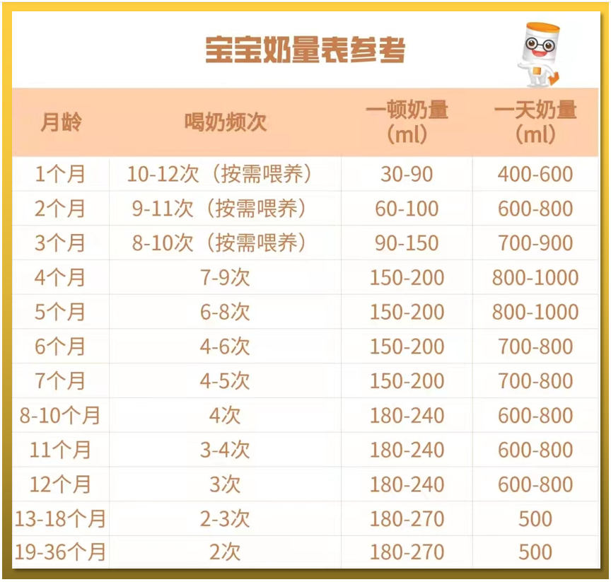 这里给到奶量表供家长们参考,但每个宝宝有个体差异,具体喂养时还需耐心观察。