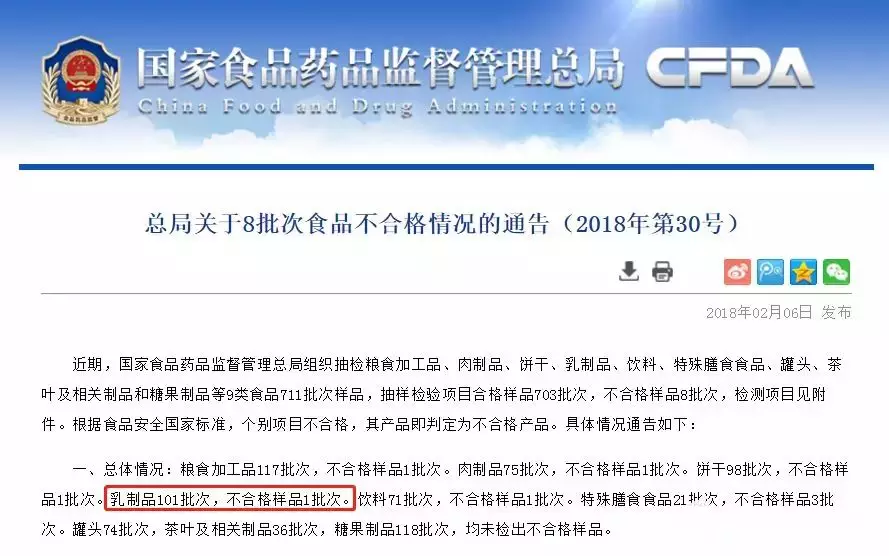 2018年2月6日,国家食品药品监督管理总局官网发布《总局关于8批次食品不合格情况的通告(2018年第30号)》。据通告,近期国家食品药品监督管理总局组织抽检乳制品101批次,不合格样品1批次。
