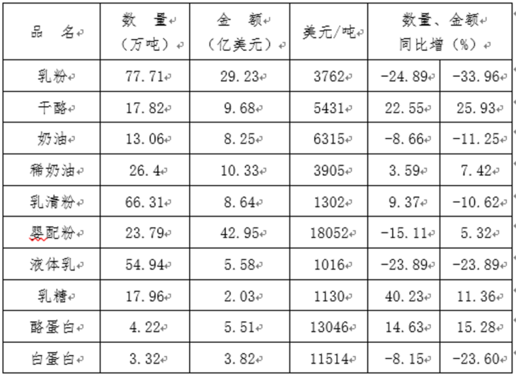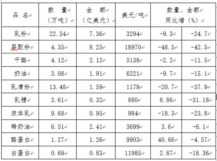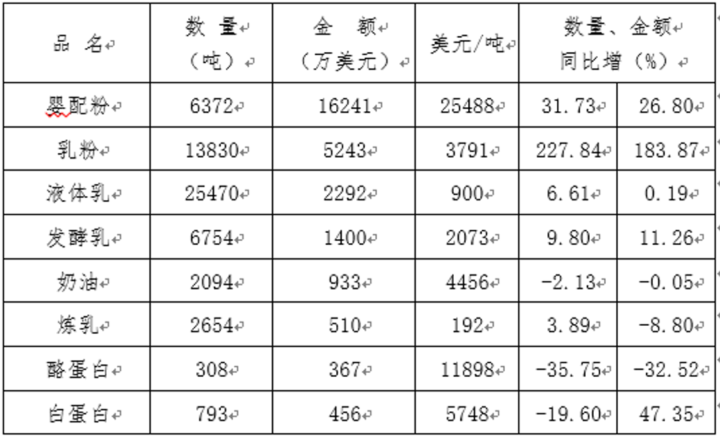 一季度乳制品进口情况如下: