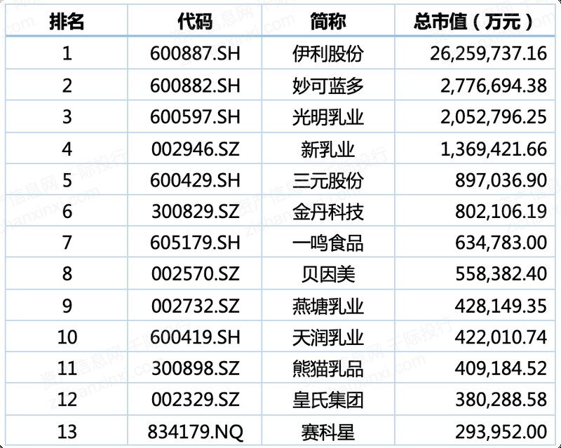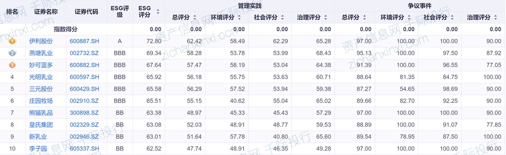 资料来源:资产信息网 千际投行 iFinD 图 乳制品行业同花顺 ESG TOP10