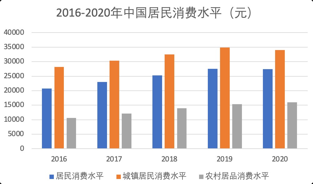 随着中国居民消费水平的增加,人们对生活质量要求也越来越高。生活饮食中不仅追求吃饱,还更加注意营养均衡。2019年居民消费水平为27504元,相比2018年增加了2259元,同比增涨8.95%。受疫情影响,2020年居民消费水平为27438元,相比2019年减少了66元,同比下降了0.24%。