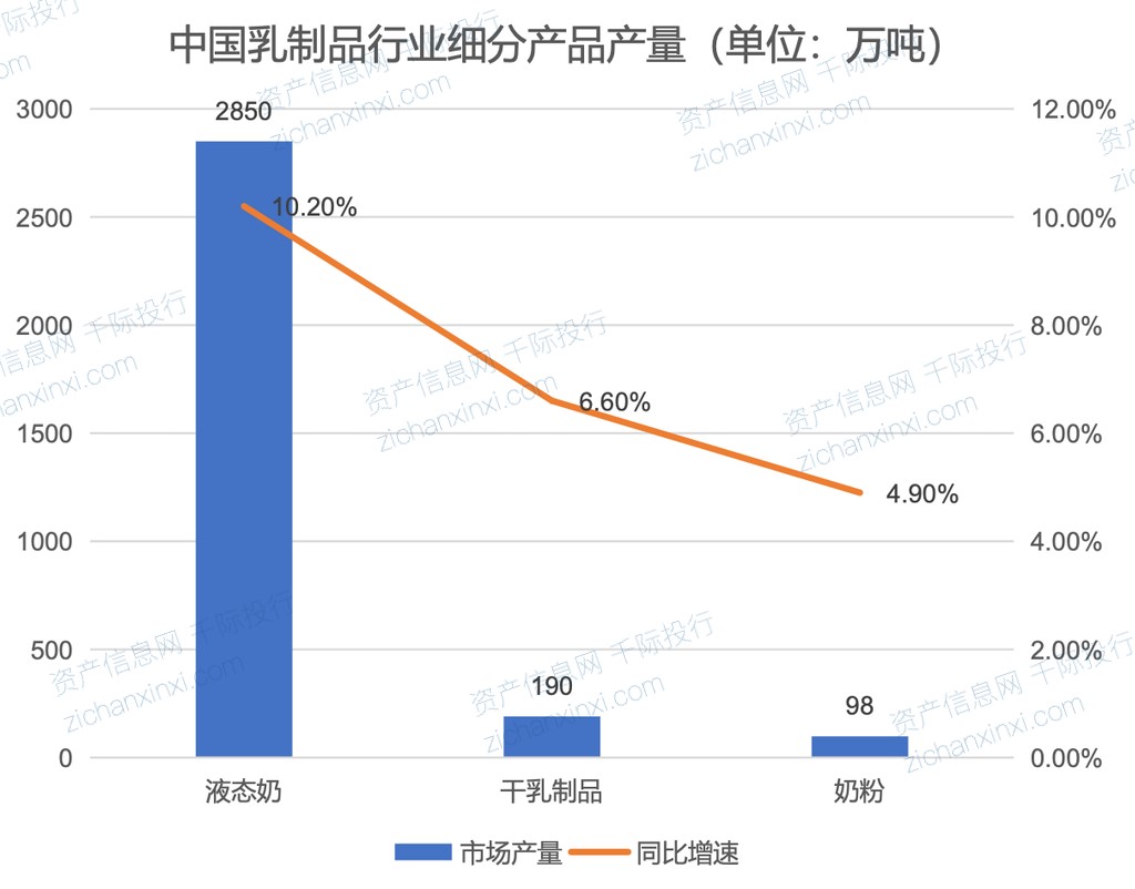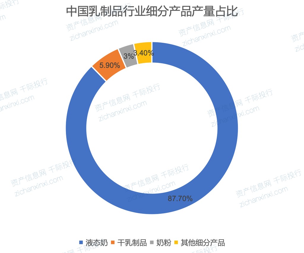 中国乳制品市场的结构分析显示出细分产品的多样性。2021年,液态奶产量约2850万吨,占总产量的87.7%,成为市场的主导产品。此外,干乳制品和奶粉的产量分别达到190万吨和98万吨,同比增长6.6%和4.9%,分别占市场产量的5.9%和3%。这一数据不仅说明液态奶在市场上的主导地位,也反映出干乳制品和奶粉等细分产品的增长潜力。